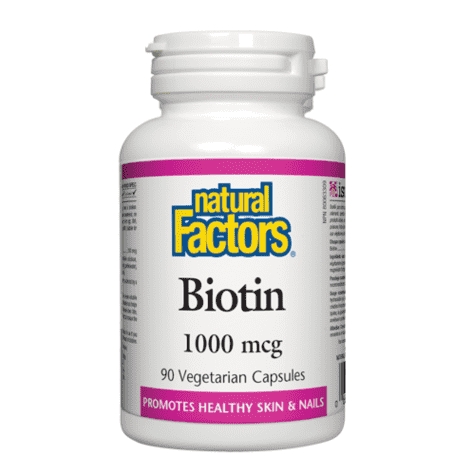 Natural Factors Biotin promotes strong, healthy nails, hair, and skin, combats biotin deficiency, and supports the breakdown of food into energy.